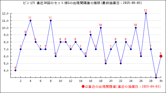 過去30回の出現周期(一番左は一番最近の周期・左から右に向かって古くなります) | セット球 | 1 | 2 | 3 | 4 | 5 | 6 | 7 | 8 | 9 | 10 | 11 | 12 | 13 | 14 | 15 | 16 | 17 | 18 | 19 | 20 | 21 | 22 | 23 | 24 | 25 | 26 | 27 | 28 | 29 | 30 |