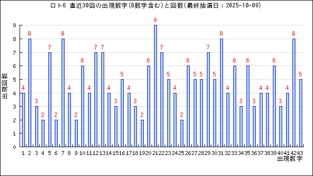 過去30回のデータから見ると、10回以上出現していない数字(出現待ち10以上)が含まれる割合は約50%を超えており、