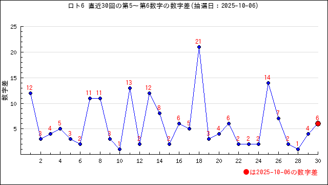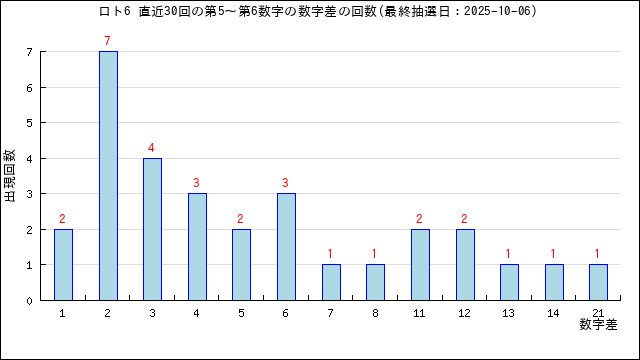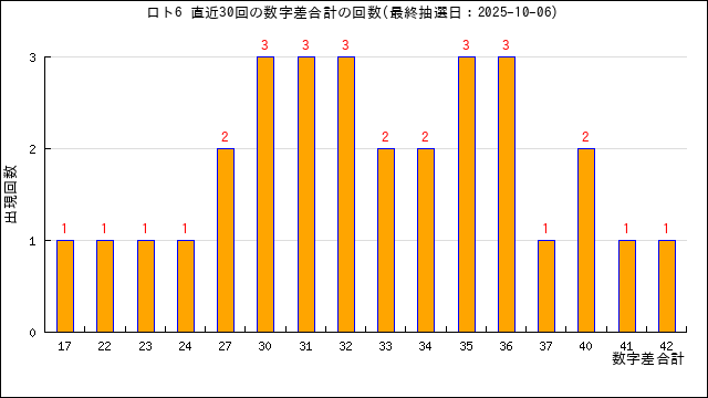 過去30回の数字差の合計の出現回数をグラフにしました。