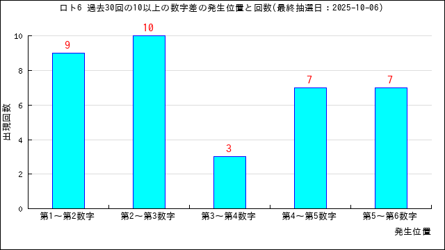 10以上離れている数字の出現位置と回数をグラフにしました。