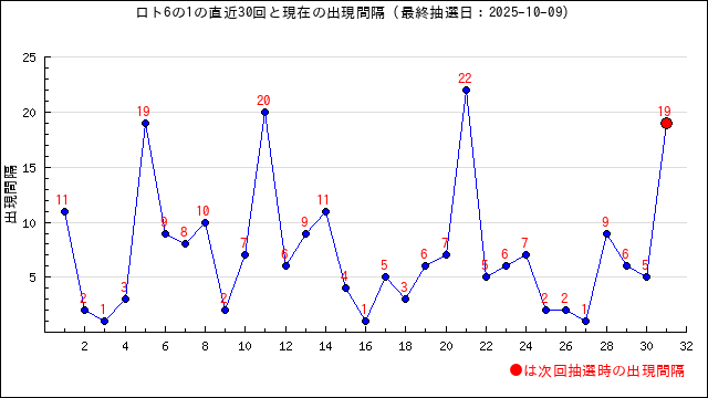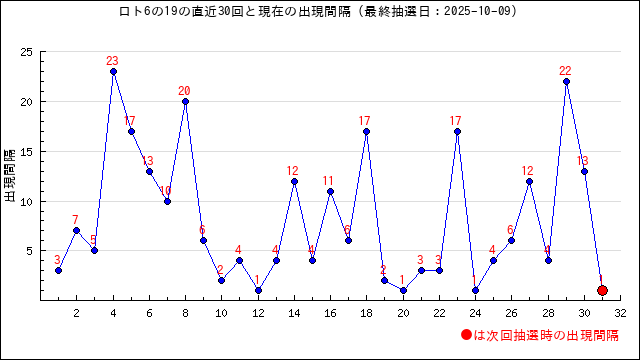 1の現在の出現間隔は19です。