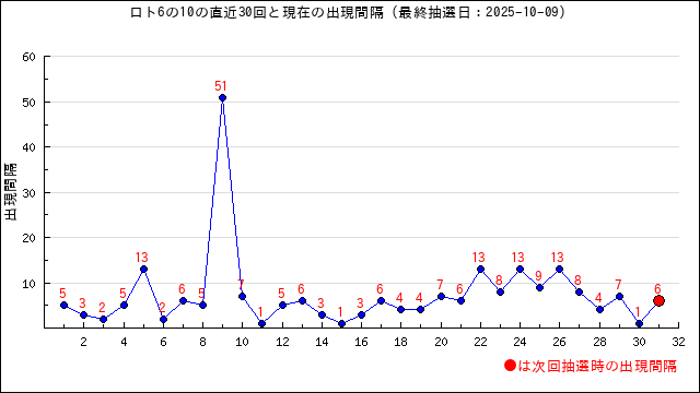 10が本数字に出現した時の出現間隔値・出現周期