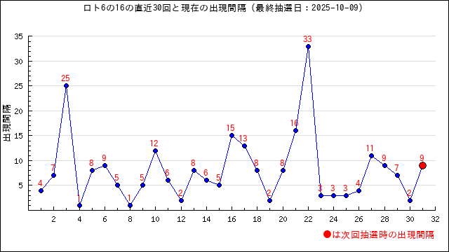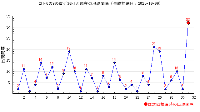 9の現在の出現間隔は32です。
