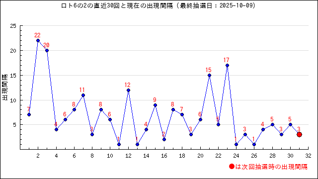 2が本数字に出現した時の出現間隔値・出現周期