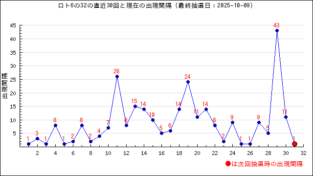 43の現在の出現間隔は13です。