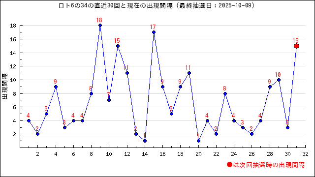 34の現在の出現間隔は15です。