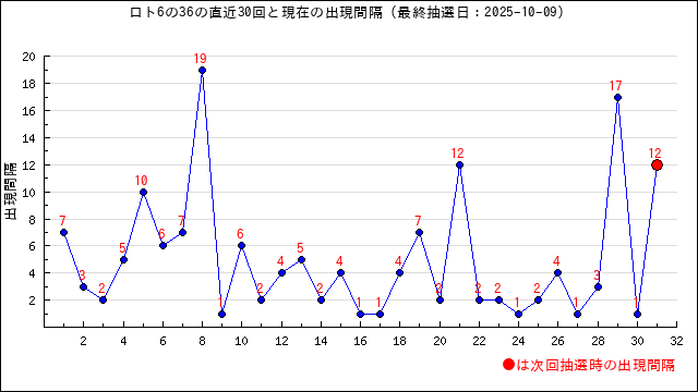 36が本数字に出現した時の出現間隔値・出現周期