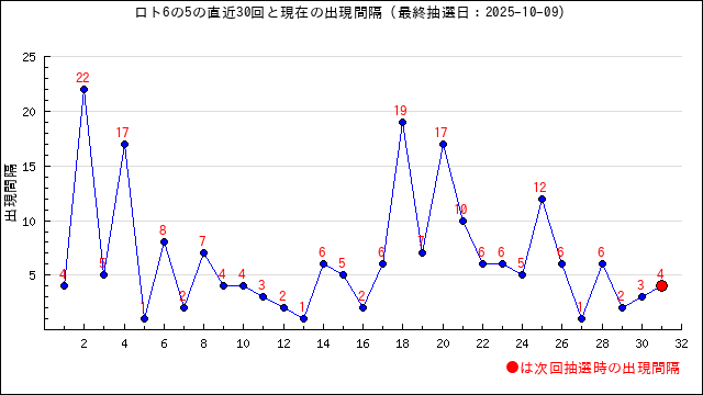 5が本数字に出現した時の出現間隔値・出現周期