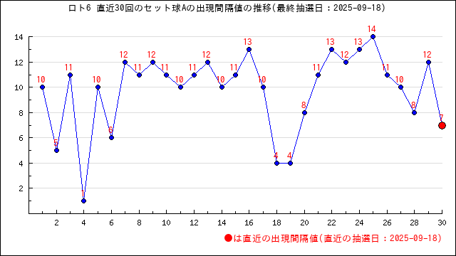 下の表は各セット球の過去30回でよく出ている出現周期です。