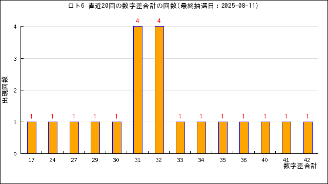 過去20回の数字差の合計の出現回数をグラフにしました。