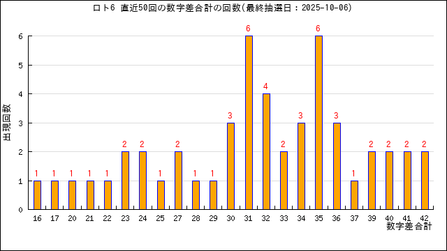 過去50回の数字差の合計の出現回数をグラフにしました。
