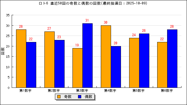 当選番号の奇数・偶数の出現数をグラフにしました。