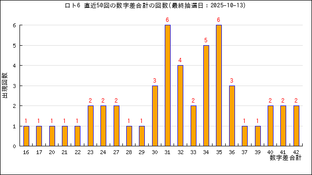 過去50回の数字差の合計の出現回数をグラフにしました。