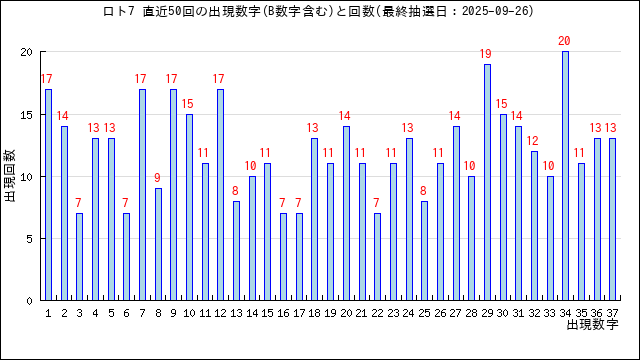 ロト7の過去50回の出目表・よく出る数字と出てない数字