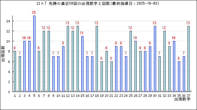 先勝の直近50回の当選数字の出現回数(B数字は含まず)