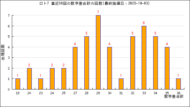 過去50回の数字差の合計の出現回数をグラフにしました。