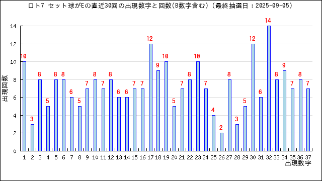 直近30回の当選番号の出現回数をグラフにしました。
