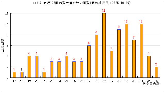 過去100回の数字差の合計の出現回数をグラフにしました。