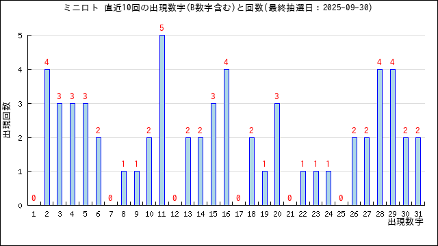 大安の直近50回の当選数字の出現回数(B数字は含まず)