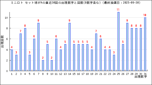 直近30回の当選番号の出現回数をグラフにしました。