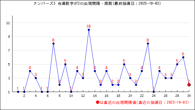 2が当選番号に出現した時の出現間隔値・出現周期