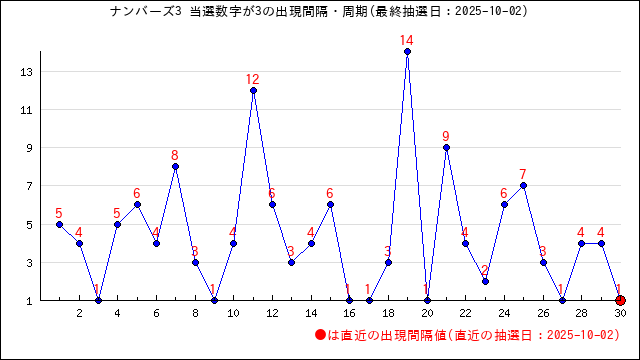 3が当選番号に出現した時の出現間隔値・出現周期