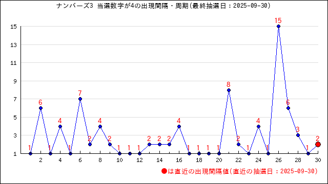 4が当選番号に出現した時の出現間隔値・出現周期