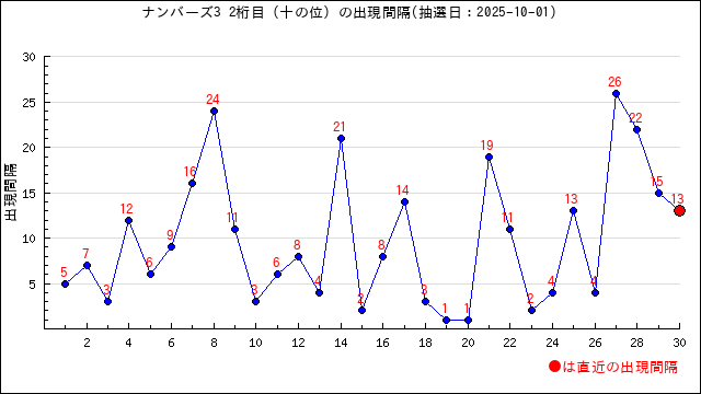 ホーム > ロト予想 > ナンバーズ3の当選番号の桁ごとの出現間隔・出現数字をグラフで分析 2023年10月21日 ナンバーズ3トップへ 最終更新日:2025年10月1日 当選番号の出現間隔・出現頻度とは? 当選番号の数字が前回出現した回号との間に何回あるのか? ようするに、どのくらいの間隔で同じ数字が出ているかを表します。 詳しく見てみる(クリックで開閉) 以下の当選番号を例に説明します。 抽選日を第5853回 2021/12/24とします。 当選番号は0-6-9 ここでは 同じ桁で同じ数字が出た場合に出現間隔値として扱います。 百の桁の0は前回の十の桁で出ていますが 桁が違うので出現間隔値としてカウントしません。 第5843回に出ているので10回目に出たことになります。 出現間隔値は10となります。 十の桁は2となります。 一の桁は前回出ているので1となります。 このように何回号前に出現したかを表す単位になります。 本ページでは この出現間隔値をグラフにして視覚的にわかりやすくしてみました。 桁ごとの出現間隔 前回の抽選情報 第6825回 2025/10/01(水) 大安 2-1-3 直近30回の1桁目(百の桁)から 3桁目(一の桁)の出現間隔値をグラフにしてみました。 本ページの見方 各桁(百の桁〜一の桁)の数字の 出現間隔値を分析しています。 出現間隔値の推移グラフ、出現ランキング 出現数字の推移グラフ、出現ランキングを用意しました。 出現数字の数字を選択すると その条件(桁と数字の組み合わせ)で 出やすい数字の分析ページに移動します。 合わせてご利用ください。 ご覧になりたい桁(位)を選択してください。 百の位 十の位 一の位 十の位の出現傾向を分析 2桁目(十の位)の出現間隔と出現数字 2桁目(十の位)の出現間隔の推移グラフ 直近30回の2桁目(十の位)の出現間隔値のグラフです。 直近の当選番号の数字は1で 出現間隔値は13でした。 2桁目(十の位)の出現間隔値ランキング 直近100回で 2桁目(十の位)の出現間隔値で出現数が多い順に並べました。 注目ポイント 6が一番よく出ていて 4が最近よく出ている出現間隔値です。 直近5回では 13,15,22,26,4 の出現間隔値が出ています。 2桁目(十の位)に出現している数字の現在の出現間隔値を見る(クリックで開閉) 数字 直近出現時の出現間隔値 現在の出現間隔値(-は前回出現) 0 3 20 1 13 - 2 8 14 3 4 4 4 26 3 5 13 5 6 2 7 7 4 6 8 22 2 9 15 1 は直近で出現回数が増えているもの は直近よりも以前の出現回数が多いもの 順位 出現間隔値 回数 出現率(直近20回の出現率) 1 6 10回 10.0%(5.0%) 2 3 8回 8.0%(5.0%) 3 7 7回 7.0%(出現なし) 3 2 7回 7.0%(10.0%) 4 1 6回 6.0%(10.0%) 4 4 6回 6.0%(15.0%) 4 8 6回 6.0%(10.0%) 4 10 6回 6.0%(出現なし) 5 5 5回 5.0%(出現なし) 6 16 4回 4.0%(出現なし) 6 13 4回 4.0%(10.0%) 6 19 4回 4.0%(5.0%) 6 11 4回 4.0%(5.0%) 7 24 3回 3.0%(出現なし) 8 14 2回 2.0%(5.0%) 8 17 2回 2.0%(出現なし) 8 9 2回 2.0%(出現なし) 8 12 2回 2.0%(出現なし) 8 22 2回 2.0%(5.0%) 9 48 1回 1.0%(出現なし) 9 15 1回 1.0%(5.0%) 9 21 1回 1.0%(5.0%) 9 23 1回 1.0%(出現なし) 9 25 1回 1.0%(出現なし) 9 26 1回 1.0%(5.0%) 9 27 1回 1.0%(出現なし) 9 28 1回 1.0%(出現なし) 9 31 1回 1.0%(出現なし) 9 42 1回 1.0%(出現なし) 2桁目(十の位)の出現数字の推移グラフ 直近30回の2桁目(十の位)の出現数字のグラフです。 直近の当選番号の数字は1で 直近5回では 1,9,8,4,3 の数字が出ています。 2桁目(十の位)の出現数字の出現回数グラフ 直近100回で 2桁目(十の位)に出現している数字の出現回数グラフです。 2桁目(十の位)に出現している数字ランキング 直近100回で 2桁目(十の位)に出現している数字を出現数が多い順に並べました。 詳細をクリックすると指定した数字の出現間隔値の分析ページで移動します。 一緒に出やすい数字なども掲載しています。 注目ポイント 0が一番よく出ていて 7が最近よく出ている数字です。 直近5回では 1,9,8,4,3 の数字が出ています。 順位 数字 出現回数 出現率(直近20回の出現率) 直近出現時の出現間隔値 現在の出現間隔値(-は前回出現)) 詳細 1 0 13回 13.0%(出現なし) 3 20 0の詳細へ 2 4 12回 12.0%(5.0%) 26 3 4の詳細へ 2 7 12回 12.0%(30.0%) 4 6 7の詳細へ 2 6 12回 12.0%(10.0%) 2 7 6の詳細へ 3 9 11回 11.0%(10.0%) 15 1 9の詳細へ 4 5 9回 9.0%(10.0%) 13 5 5の詳細へ 5 3 8回 8.0%(15.0%) 4 4 3の詳細へ 5 2 8回 8.0%(5.0%) 8 14 2の詳細へ 5 1 8回 8.0%(10.0%) 13 - 1の詳細へ 6 8 7回 7.0%(5.0%) 22 2 8の詳細へ 無料分析をご利用の皆さまへ 🔔 無料分析をご利用の皆さまへ いつも「うまさく」の分析ページをご利用いただきありがとうございます。 この無料ページは、うまさくセレクトや 巫女グッズ・開運アイテムをご購入いただいた方々の支え、 そして一部広告収入によって運営されています。 「この分析、参考になった」 「当たったからお礼したい」「感謝の気持ちで応援したい」という方は、 450円(1ヶ月分/買い切り型)から使える「うまさくセレクト」や、 応援の気持ちとしてグッズをご購入いただけると嬉しいです。 🛍️【応援の方法はこちら】 ▶ うまさくグッズ販売サイト ▶ Amazonほしい物リスト(うまさくへの差し入れです😀) 💡どちらもあなたの応援が、うまさくの