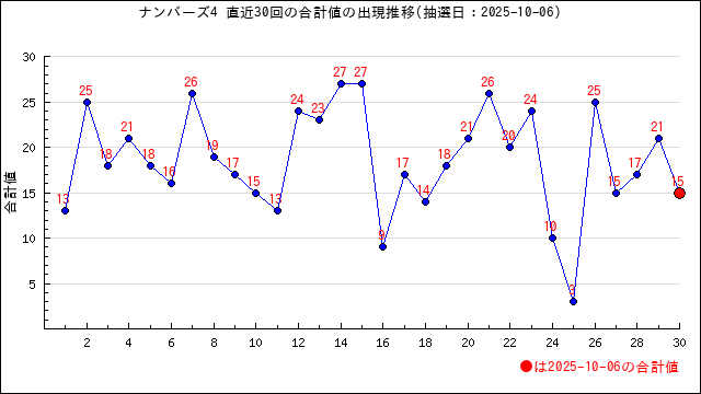 過去30回の当選番号の合計値の出現推移グラフです。