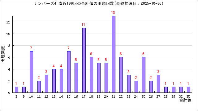 過去100回分の当選番号の合計値の出目表にしました。