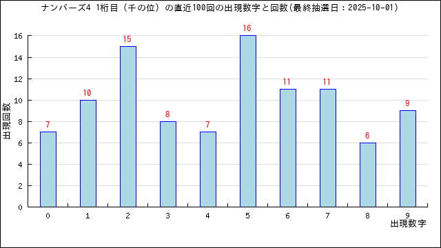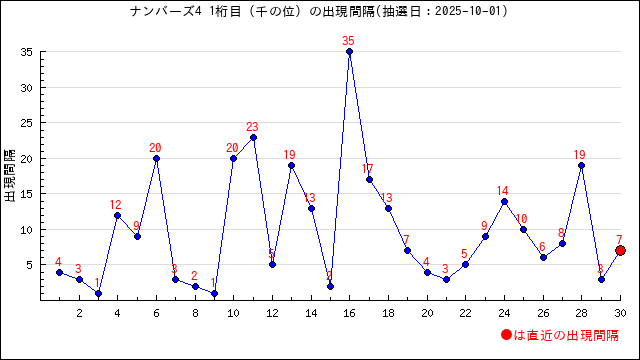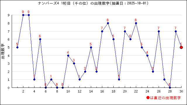 ホーム > ロト予想 > ナンバーズ4の当選番号の桁ごとの出現間隔・出現数字をグラフで分析 2023年10月21日 ナンバーズ4トップへ 最終更新日:2025年10月1日 当選番号の出現間隔・出現頻度とは? 当選番号の数字が前回出現した回号との間に何回あるのか? ようするに、どのくらいの間隔で同じ数字が出ているかを表します。 詳しく見てみる(クリックで開閉) 以下の当選番号を例に説明します。 抽選日を第5853回 2021/12/24とします。 当選番号は1-3-9-0 ここでは 同じ桁で同じ数字が出た場合に出現間隔値として扱います。 千の桁の1は前回の一の桁で出ていますが 桁が違うので出現間隔値としてカウントしません。 第5843回に出ているので10回目に出たことになります。 出現間隔値は10となります。 百の桁は2となります。 十の桁は前回出ているので1となります。 このように何回号前に出現したかを表す単位になります。 本ページでは この出現間隔値をグラフにして視覚的にわかりやすくしてみました。 桁ごとの出現間隔 前回の抽選情報 第6825回 2025/10/01(水) 大安 5-2-8-0 直近30回の1桁目(千の桁)から 4桁目(一の桁)の出現間隔値をグラフにしてみました。 本ページの見方 各桁(千の桁〜一の桁)の数字の 出現間隔値を分析しています。 出現間隔値の推移グラフ、出現ランキング 出現数字の推移グラフ、出現ランキングを用意しました。 出現数字の数字を選択すると その条件(桁と数字の組み合わせ)で 出やすい数字の分析ページに移動します。 合わせてご利用ください。 ご覧になりたい桁(位)を選択してください。 千の位 百の位 十の位 一の位 千の位の出現傾向を分析1桁目(千の位)の出現間隔と出現数字 1桁目(千の位)の出現間隔の推移グラフ 直近30回の1桁目(千の位)の出現間隔値のグラフです。 直近の当選番号の数字は5で 出現間隔値は7でした。 1桁目(千の位)の出現間隔値のランキング 直近100回で 1桁目(千の位)の出現間隔値で出現数が多い順に並べました。 注目ポイント 1が一番よく出ていて 19が最近よく出ている出現間隔値です。 直近5回では 7,3,19,8,6 の出現間隔値が出ています。 1桁目(千の位)に出現している数字の現在の出現間隔値を見る(クリックで開閉) 数字 直近出現時の出現間隔値 現在の出現間隔値(-は前回出現) 0 19 2 1 8 3 2 10 5 3 23 19 4 14 6 5 7 - 6 3 9 7 3 1 8 5 8 9 1 27 は直近で出現回数が増えているもの は直近よりも以前の出現回数が多いもの 順位 出現間隔値 回数 出現率(直近20回の出現率) 1 1 11回 11.0%(出現なし) 2 3 10回 10.0%(10.0%) 2 2 10回 10.0%(5.0%) 3 6 7回 7.0%(5.0%) 4 20 6回 6.0%(出現なし) 5 4 5回 5.0%(5.0%) 5 8 5回 5.0%(5.0%) 5 10 5回 5.0%(5.0%) 6 9 4回 4.0%(5.0%) 6 5 4回 4.0%(10.0%) 6 7 4回 4.0%(10.0%) 6 13 4回 4.0%(10.0%) 7 18 3回 3.0%(出現なし) 7 14 3回 3.0%(5.0%) 7 19 3回 3.0%(10.0%) 8 30 2回 2.0%(出現なし) 8 21 2回 2.0%(出現なし) 8 25 2回 2.0%(出現なし) 8 17 2回 2.0%(5.0%) 9 35 1回 1.0%(5.0%) 9 12 1回 1.0%(出現なし) 9 15 1回 1.0%(出現なし) 9 22 1回 1.0%(出現なし) 9 23 1回 1.0%(5.0%) 9 26 1回 1.0%(出現なし) 9 29 1回 1.0%(出現なし) 9 32 1回 1.0%(出現なし) 1桁目(千の位)の出現数字の推移グラフ 直近30回の1桁目(千の位)の出現数字のグラフです。 直近の当選番号の数字は5で 直近5回では 5,7,0,1,7 の数字が出ています。 1桁目(千の位)の出現数字の出現回数グラフ 直近100回で 1桁目(千の位)に出現している数字の出現回数グラフです。 1桁目(千の位)に出現している数字ランキング 直近100回で 1桁目(千の位)に出現している数字を出現数が多い順に並べました。 詳細をクリックすると指定した数字の出現間隔値の分析ページで移動します。 一緒に出やすい数字なども掲載しています。 注目ポイント 5が一番よく出ていて 7が最近よく出ている数字です。 直近5回では 5,7,0,1,7 の数字が出ています。 順位 数字 出現回数 出現率(直近20回の出現率) 直近出現時の出現間隔値 現在の出現間隔値(-は前回出現)) 詳細 1 5 16回 16.0%(15.0%) 7 - 5の詳細へ 2 2 15回 15.0%(15.0%) 10 5 2の詳細へ 3 7 11回 11.0%(20.0%) 3 1 7の詳細へ 3 6 11回 11.0%(10.0%) 3 9 6の詳細へ 4 1 10回 10.0%(15.0%) 8 3 1の詳細へ 5 9 9回 9.0%(出現なし) 1 27 9の詳細へ 6 3 8回 8.0%(5.0%) 23 19 3の詳細へ 7 4 7回 7.0%(5.0%) 14 6 4の詳細へ 7 0 7回 7.0%(5.0%) 19 2 0の詳細へ 8 8 6回 6.0%(10.0%) 5 8 8の詳細へ 無料分析をご利用の皆さまへ 🔔 無料分析をご利用の皆さまへ いつも「うまさく」の分析ページをご利用いただきありがとうございます。 この無料ページは、うまさくセレクトや 巫女グッズ・開運アイテムをご購入いただいた方々の支え、 そして一部広告収入によって運営されています。 「この分析、参考になった」 「当たったからお礼したい」「感謝の気持ちで応援したい」という方は、 450円(1ヶ月分/買い切り型)から使える「うまさくセレクト」や、 応援の気持ちとしてグッズをご購入いただけると嬉しいです。 🛍️【応援の方法はこちら】 ▶ うまさくグッズ販売サイト ▶ Amazonほしい物リスト(うまさくへの差し入れです😀) 💡どちらもあなたの応援が、うまさくの次の進化につながります✨ あなたの応