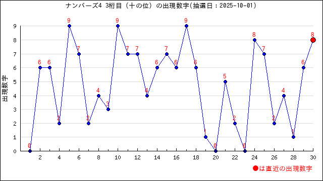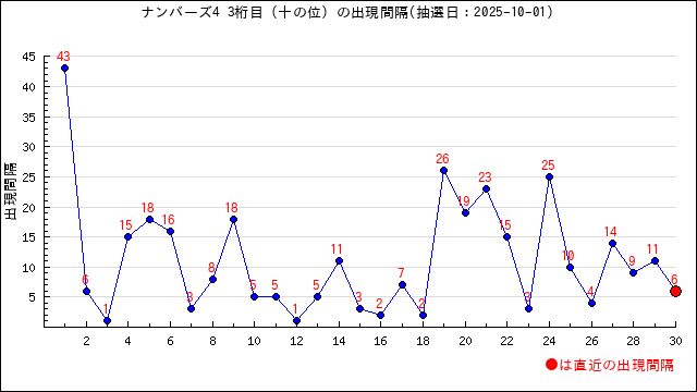 ホーム > ロト予想 > ナンバーズ4の当選番号の桁ごとの出現間隔・出現数字をグラフで分析 2023年10月21日 ナンバーズ4トップへ 最終更新日:2025年10月1日 当選番号の出現間隔・出現頻度とは? 当選番号の数字が前回出現した回号との間に何回あるのか? ようするに、どのくらいの間隔で同じ数字が出ているかを表します。 詳しく見てみる(クリックで開閉) 以下の当選番号を例に説明します。 抽選日を第5853回 2021/12/24とします。 当選番号は1-3-9-0 ここでは 同じ桁で同じ数字が出た場合に出現間隔値として扱います。 千の桁の1は前回の一の桁で出ていますが 桁が違うので出現間隔値としてカウントしません。 第5843回に出ているので10回目に出たことになります。 出現間隔値は10となります。 百の桁は2となります。 十の桁は前回出ているので1となります。 このように何回号前に出現したかを表す単位になります。 本ページでは この出現間隔値をグラフにして視覚的にわかりやすくしてみました。 桁ごとの出現間隔 前回の抽選情報 第6825回 2025/10/01(水) 大安 5-2-8-0 直近30回の1桁目(千の桁)から 4桁目(一の桁)の出現間隔値をグラフにしてみました。 本ページの見方 各桁(千の桁〜一の桁)の数字の 出現間隔値を分析しています。 出現間隔値の推移グラフ、出現ランキング 出現数字の推移グラフ、出現ランキングを用意しました。 出現数字の数字を選択すると その条件(桁と数字の組み合わせ)で 出やすい数字の分析ページに移動します。 合わせてご利用ください。 ご覧になりたい桁(位)を選択してください。 千の位 百の位 十の位 一の位 十の位の出現傾向を分析 3桁目(十の位)の出現間隔と出現数字 3桁目(十の位)の出現間隔の推移グラフ 直近30回の3桁目(十の位)の出現間隔値のグラフです。 直近の当選番号の数字は8で 出現間隔値は6でした。 3桁目(十の位)の出現間隔値のランキング 直近100回で 3桁目(十の位)の出現間隔値で出現数が多い順に並べました。 注目ポイント 4が一番よく出ていて 11が最近よく出ている出現間隔値です。 直近5回では 6,11,9,14,4 の出現間隔値が出ています。 3桁目(十の位)に出現している数字の現在の出現間隔値を見る(クリックで開閉) 数字 直近出現時の出現間隔値 現在の出現間隔値(-は前回出現) 0 3 7 1 9 2 2 4 4 3 18 21 4 14 3 5 23 9 6 11 1 7 10 5 8 6 - 9 7 13 は直近で出現回数が増えているもの は直近よりも以前の出現回数が多いもの 順位 出現間隔値 回数 出現率(直近20回の出現率) 1 4 13回 13.0%(5.0%) 2 3 11回 11.0%(10.0%) 3 6 8回 8.0%(5.0%) 4 2 6回 6.0%(10.0%) 4 1 6回 6.0%(5.0%) 5 8 5回 5.0%(出現なし) 5 10 5回 5.0%(5.0%) 5 5 5回 5.0%(10.0%) 6 13 4回 4.0%(出現なし) 6 16 4回 4.0%(出現なし) 7 15 3回 3.0%(5.0%) 7 11 3回 3.0%(10.0%) 7 20 3回 3.0%(出現なし) 7 33 3回 3.0%(出現なし) 8 12 2回 2.0%(出現なし) 8 14 2回 2.0%(5.0%) 8 9 2回 2.0%(5.0%) 8 23 2回 2.0%(5.0%) 8 18 2回 2.0%(出現なし) 8 7 2回 2.0%(5.0%) 9 45 1回 1.0%(出現なし) 9 24 1回 1.0%(出現なし) 9 25 1回 1.0%(5.0%) 9 26 1回 1.0%(5.0%) 9 30 1回 1.0%(出現なし) 9 32 1回 1.0%(出現なし) 9 19 1回 1.0%(5.0%) 9 43 1回 1.0%(出現なし) 9 21 1回 1.0%(出現なし) 3桁目(十の位)の出現数字の推移グラフ 直近30回の3桁目(十の位)の出現数字のグラフです。 直近の当選番号の数字は8で 直近5回では 8,6,1,4,2 の数字が出ています。 3桁目(十の位)の出現数字の出現回数グラフ 直近100回で 3桁目(十の位)に出現している数字の出現回数グラフです。 3桁目(十の位)に出現している数字ランキング 直近100回で 3桁目(十の位)に出現している数字を出現数が多い順に並べました。 詳細をクリックすると指定した数字の出現間隔値の分析ページで移動します。 一緒に出やすい数字なども掲載しています。 注目ポイント 6,7が一番よく出ていて 7が最近よく出ている数字です。 直近5回では 8,6,1,4,2 の数字が出ています。 順位 数字 出現回数 出現率(直近20回の出現率) 直近出現時の出現間隔値 現在の出現間隔値(-は前回出現)) 詳細 1 6 14回 14.0%(20.0%) 11 1 6の詳細へ 1 7 14回 14.0%(20.0%) 10 5 7の詳細へ 2 9 12回 12.0%(5.0%) 7 13 9の詳細へ 3 5 11回 11.0%(5.0%) 23 9 5の詳細へ 4 4 10回 10.0%(10.0%) 14 3 4の詳細へ 4 1 10回 10.0%(10.0%) 9 2 1の詳細へ 5 8 9回 9.0%(10.0%) 6 - 8の詳細へ 6 2 8回 8.0%(10.0%) 4 4 2の詳細へ 7 0 6回 6.0%(10.0%) 3 7 0の詳細へ 7 3 6回 6.0%(出現なし) 18 21 3の詳細へ 無料分析をご利用の皆さまへ 🔔 無料分析をご利用の皆さまへ いつも「うまさく」の分析ページをご利用いただきありがとうございます。 この無料ページは、うまさくセレクトや 巫女グッズ・開運アイテムをご購入いただいた方々の支え、 そして一部広告収入によって運営されています。 「この分析、参考になった」 「当たったからお礼したい」「感謝の気持ちで応援したい」という方は、 450円(1ヶ月分/買い切り型)から使える「うまさくセレクト」や、 応援の気持ちとしてグッズをご購入いただけると嬉しいです。 🛍️【応援の方法はこちら】 ▶ うまさくグッズ販売サイト ▶ Amazonほしい物リスト(うまさくへの差し入れです😀) 💡どちらもあなたの応援が、うまさく