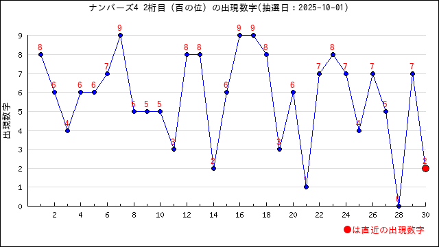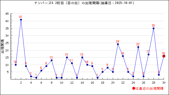 ホーム > ロト予想 > ナンバーズ4の当選番号の桁ごとの出現間隔・出現数字をグラフで分析 2023年10月21日 ナンバーズ4トップへ 最終更新日:2025年10月1日 当選番号の出現間隔・出現頻度とは? 当選番号の数字が前回出現した回号との間に何回あるのか? ようするに、どのくらいの間隔で同じ数字が出ているかを表します。 詳しく見てみる(クリックで開閉) 以下の当選番号を例に説明します。 抽選日を第5853回 2021/12/24とします。 当選番号は1-3-9-0 ここでは 同じ桁で同じ数字が出た場合に出現間隔値として扱います。 千の桁の1は前回の一の桁で出ていますが 桁が違うので出現間隔値としてカウントしません。 第5843回に出ているので10回目に出たことになります。 出現間隔値は10となります。 百の桁は2となります。 十の桁は前回出ているので1となります。 このように何回号前に出現したかを表す単位になります。 本ページでは この出現間隔値をグラフにして視覚的にわかりやすくしてみました。 桁ごとの出現間隔 前回の抽選情報 第6825回 2025/10/01(水) 大安 5-2-8-0 直近30回の1桁目(千の桁)から 4桁目(一の桁)の出現間隔値をグラフにしてみました。 本ページの見方 各桁(千の桁〜一の桁)の数字の 出現間隔値を分析しています。 出現間隔値の推移グラフ、出現ランキング 出現数字の推移グラフ、出現ランキングを用意しました。 出現数字の数字を選択すると その条件(桁と数字の組み合わせ)で 出やすい数字の分析ページに移動します。 合わせてご利用ください。 ご覧になりたい桁(位)を選択してください。 千の位 百の位 十の位 一の位 百の位の出現傾向を分析 2桁目(百の位)の出現間隔と出現数字 2桁目(百の位)の出現間隔の推移グラフ 直近30回の2桁目(百の位)の出現間隔値のグラフです。 直近の当選番号の数字は2で 出現間隔値は16でした。 2桁目(百の位)の出現間隔値のランキング 直近100回で 2桁目(百の位)の出現間隔値で出現数が多い順に並べました。 注目ポイント 1が一番よく出ていて 5が最近よく出ている出現間隔値です。 直近5回では 16,3,35,17,2 の出現間隔値が出ています。 2桁目(百の位)に出現している数字の現在の出現間隔値を見る(クリックで開閉) 数字 直近出現時の出現間隔値 現在の出現間隔値(-は前回出現) 0 35 2 1 24 9 2 16 - 3 8 11 4 22 5 5 17 3 6 5 10 7 3 1 8 5 7 9 1 13 は直近で出現回数が増えているもの は直近よりも以前の出現回数が多いもの 順位 出現間隔値 回数 出現率(直近20回の出現率) 1 1 10回 10.0%(10.0%) 2 2 7回 7.0%(10.0%) 2 4 7回 7.0%(出現なし) 2 9 7回 7.0%(5.0%) 2 7 7回 7.0%(出現なし) 3 6 6回 6.0%(出現なし) 3 8 6回 6.0%(5.0%) 3 10 6回 6.0%(5.0%) 4 15 5回 5.0%(10.0%) 4 3 5回 5.0%(5.0%) 5 5 4回 4.0%(15.0%) 5 17 4回 4.0%(5.0%) 6 13 3回 3.0%(出現なし) 6 16 3回 3.0%(10.0%) 6 12 3回 3.0%(出現なし) 7 22 2回 2.0%(5.0%) 7 18 2回 2.0%(出現なし) 7 24 2回 2.0%(5.0%) 7 11 2回 2.0%(5.0%) 8 66 1回 1.0%(出現なし) 8 14 1回 1.0%(出現なし) 8 19 1回 1.0%(出現なし) 8 20 1回 1.0%(出現なし) 8 26 1回 1.0%(出現なし) 8 32 1回 1.0%(出現なし) 8 33 1回 1.0%(出現なし) 8 35 1回 1.0%(5.0%) 8 41 1回 1.0%(出現なし) 2桁目(百の位)の出現数字の推移グラフ 直近30回の2桁目(百の位)の出現数字のグラフです。 直近の当選番号の数字は2で 直近5回では 2,7,0,5,7 の数字が出ています。 2桁目(百の位)の出現数字の出現回数グラフ 直近100回で 2桁目(百の位)に出現している数字の出現回数グラフです。 2桁目(百の位)に出現している数字ランキング 直近100回で 2桁目(百の位)に出現している数字を出現数が多い順に並べました。 詳細をクリックすると指定した数字の出現間隔値の分析ページで移動します。 一緒に出やすい数字なども掲載しています。 注目ポイント 7が一番よく出ていて 8が最近よく出ている数字です。 直近5回では 2,7,0,5,7 の数字が出ています。 順位 数字 出現回数 出現率(直近20回の出現率) 直近出現時の出現間隔値 現在の出現間隔値(-は前回出現)) 詳細 1 7 14回 14.0%(20.0%) 3 1 7の詳細へ 2 3 13回 13.0%(10.0%) 8 11 3の詳細へ 3 1 12回 12.0%(5.0%) 24 9 1の詳細へ 4 4 11回 11.0%(5.0%) 22 5 4の詳細へ 5 8 10回 10.0%(20.0%) 5 7 8の詳細へ 5 5 10回 10.0%(5.0%) 17 3 5の詳細へ 6 9 9回 9.0%(10.0%) 1 13 9の詳細へ 6 6 9回 9.0%(10.0%) 5 10 6の詳細へ 7 0 7回 7.0%(5.0%) 35 2 0の詳細へ 8 2 5回 5.0%(10.0%) 16 - 2の詳細へ 無料分析をご利用の皆さまへ 🔔 無料分析をご利用の皆さまへ いつも「うまさく」の分析ページをご利用いただきありがとうございます。 この無料ページは、うまさくセレクトや 巫女グッズ・開運アイテムをご購入いただいた方々の支え、 そして一部広告収入によって運営されています。 「この分析、参考になった」 「当たったからお礼したい」「感謝の気持ちで応援したい」という方は、 450円(1ヶ月分/買い切り型)から使える「うまさくセレクト」や、 応援の気持ちとしてグッズをご購入いただけると嬉しいです。 🛍️【応援の方法はこちら】 ▶ うまさくグッズ販売サイト ▶ Amazonほしい物リスト(うまさくへの差し入れです😀) 💡どちらもあなたの応援が、うまさくの次の進化につ
