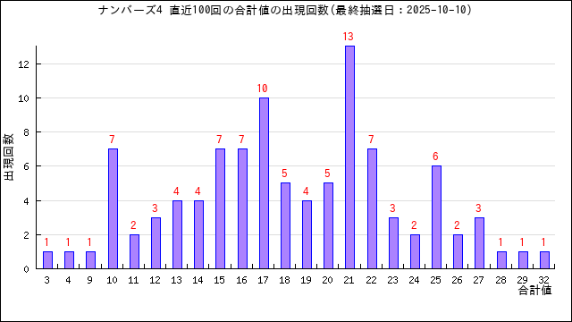 過去100回分の当選番号の合計値の出目表にしました。