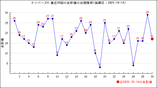過去30回の当選番号の合計値の出現推移グラフです。