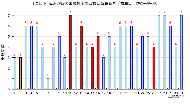過去30回分の当選番号の出現回数のグラフです。